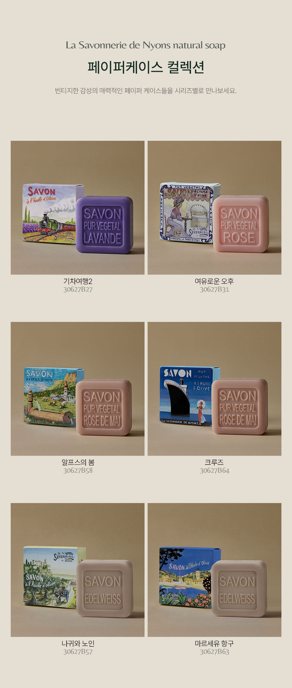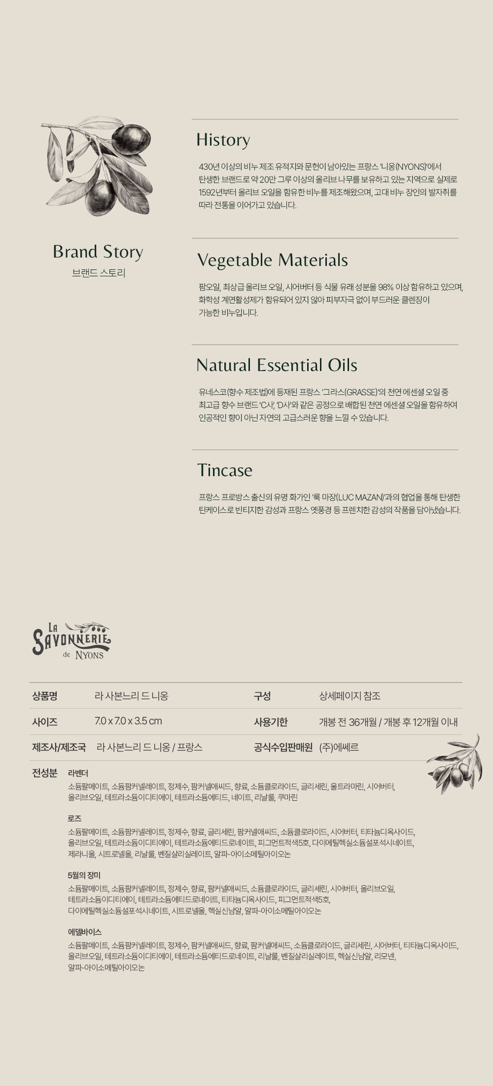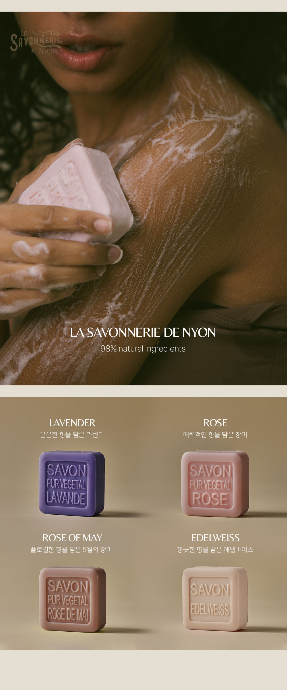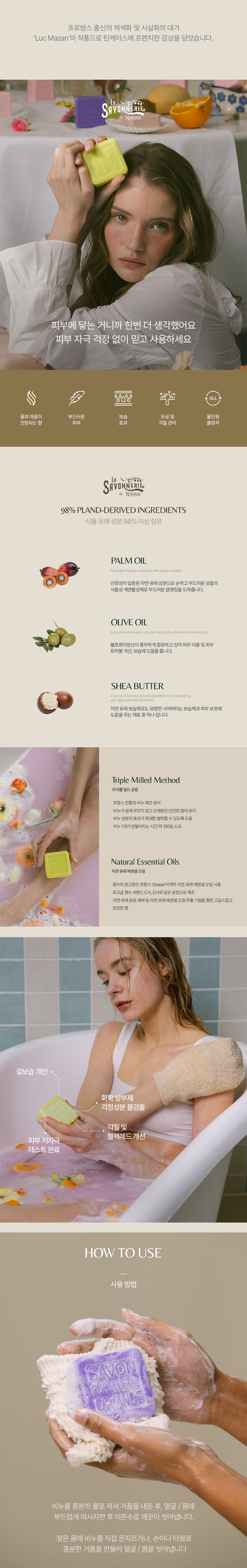프랑스 니옹 전통 공법으로 만든 트리플 밀드 비누로, 천연 에센셜 오일과 자연 유래 성분을 사용해 높은 순도와 향 지속력, 저자극 세정 효과를 갖춘 프리미엄 비누입니다.